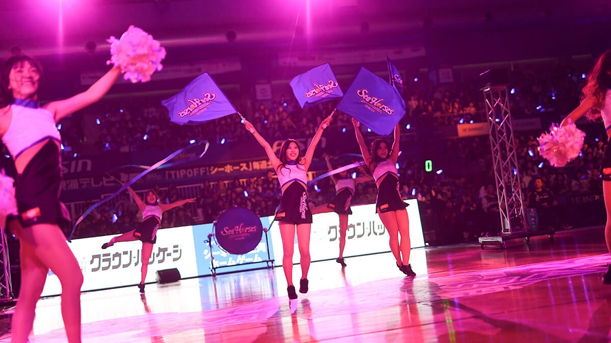 チアリーダー-Super Girls-がその名の通り、応援の先頭に立ち、アリーナに集うすべてのエナジーをひとつに束ねる。華やかなパフォーマンスと青援が会場をさらに熱くする。