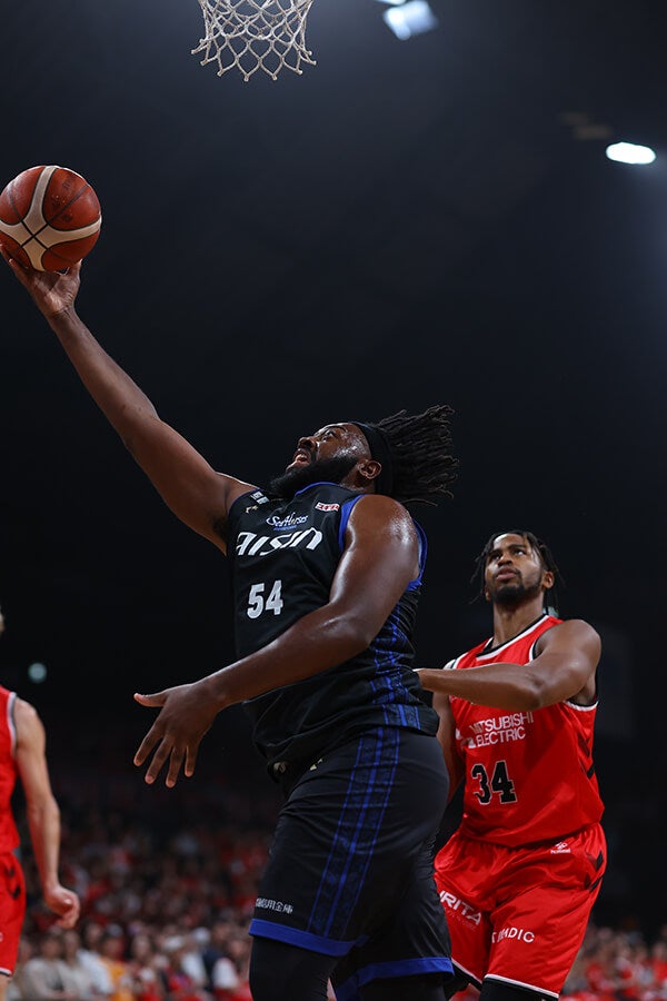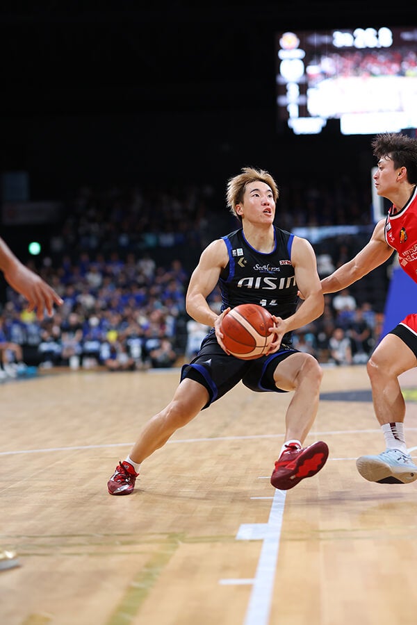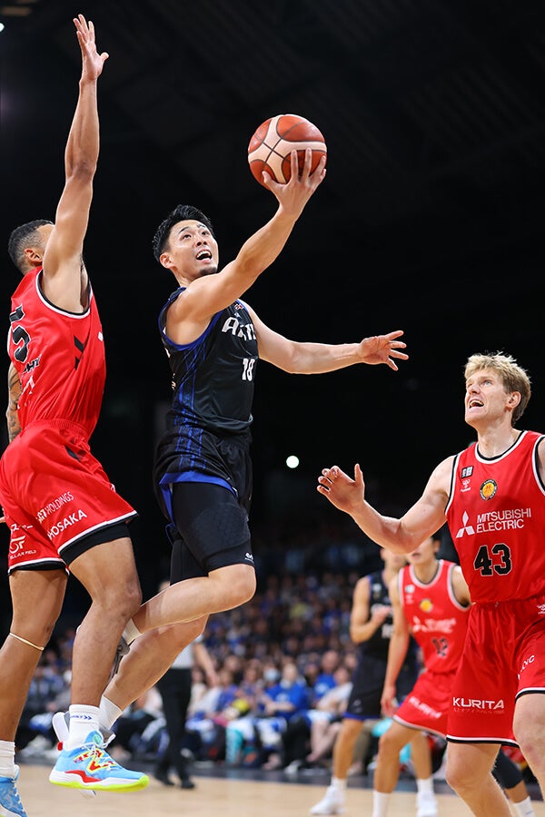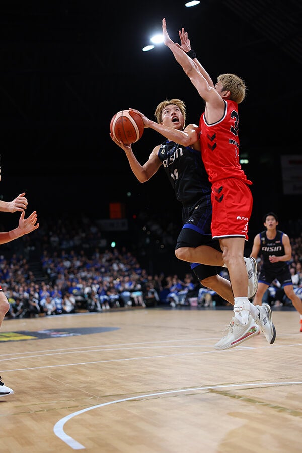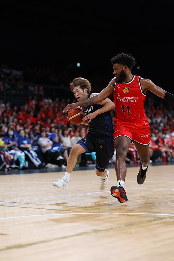 残り2分、名古屋D#11ヘンリーの3Pシュートでリードを5点に広げられるが、#7長野のボーナススローで食らいつく。#10レイマンが#11ヘンリーのアタックをブロックショットで叩き落とすと、さらに次のポゼッションでも#11ヘンリーからオフェンスファウルを誘発してディフェンスで踏みとどまる。残り1分、#13須田の3Pシュートで再び1点差に。名古屋Dにボーナススローで引き離されるが、#7長野が老獪にファウルを誘発。ボーナススローでお返しし、47-45の2点差で後半へ。