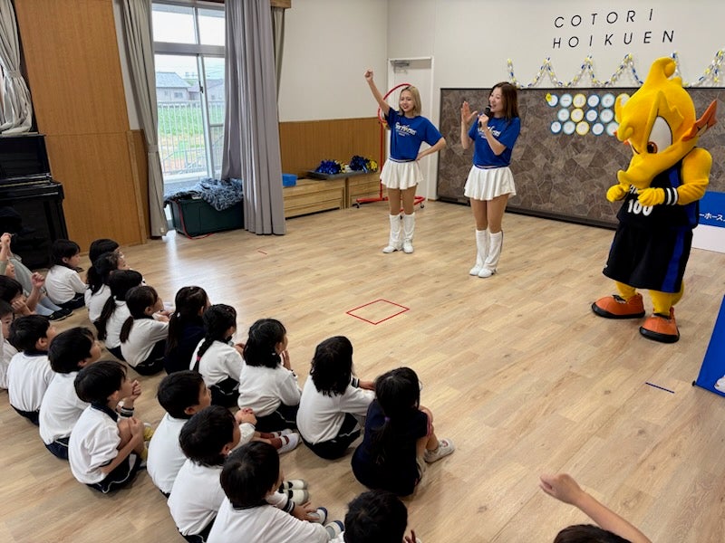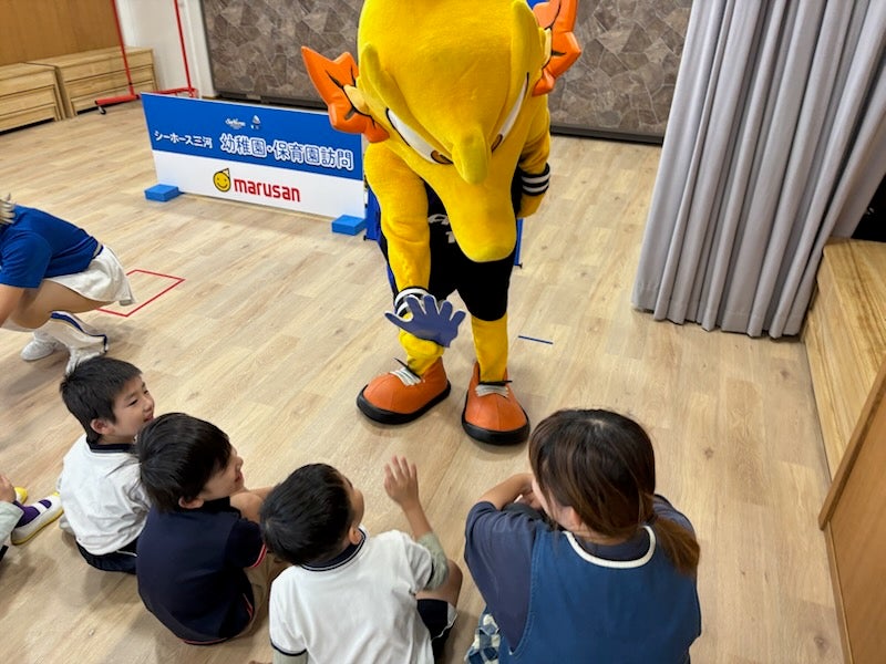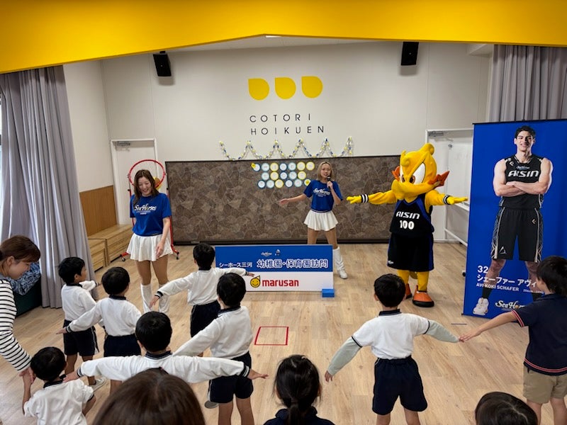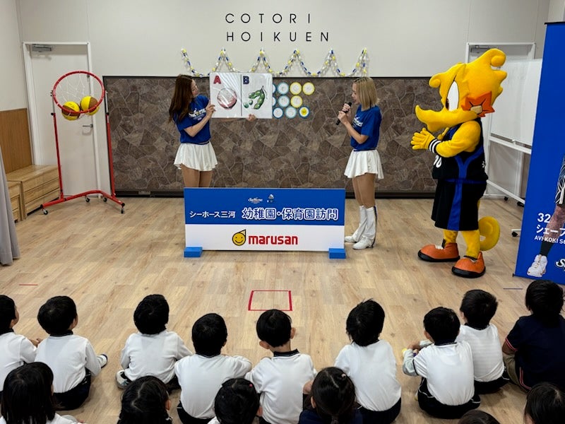 2025年10月21日(火)、シーホースくんとSuper GirlsのMISA、RIKOがことり保育園(刈谷市)を訪問し、園児の皆さんと一緒にクイズやダンスを楽しみました。