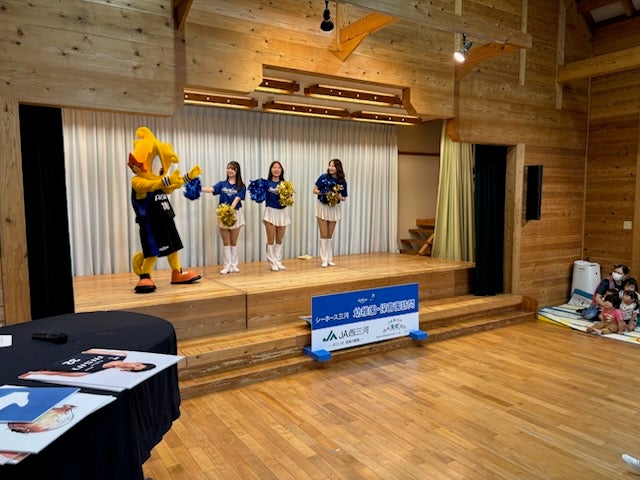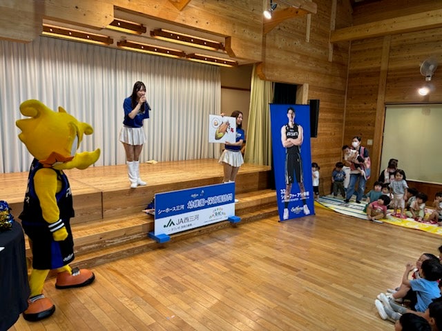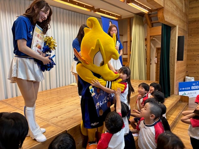 2025年10月15日(水)、シーホースくんとSuper GirlsのSAHO、CHINA、HIBIYUが矢田つぼみ保育園(西尾市)を訪問し、園児の皆さんと一緒にクイズやダンスを楽しみました。