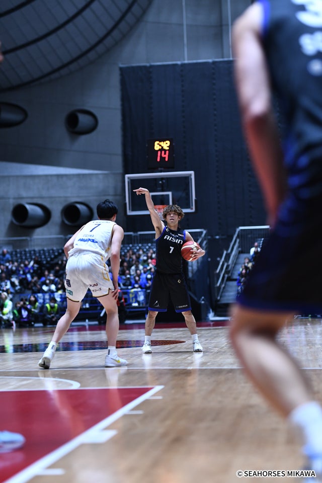 残り1分には#27石井がブロックショットからすぐさまゴールへ走りレイアップを決め、三河のバスケットを体現して23-33と二桁リードを築き上げる。宇都宮のタイムアウト明けも勢いは止まらず、#7長野が#19西田(優)の3Pシュートを演出して、25-36と二桁リードのまま試合を折り返す。