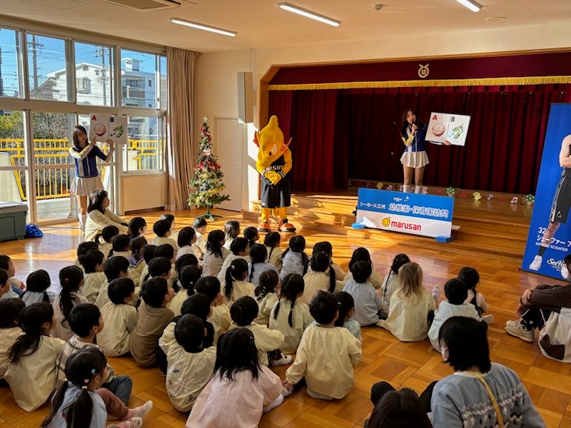 2025年12月18日(木)、シーホースくんとSuper GirlsのCHINA、SAHOが日高幼児園(刈谷市)を訪問し、園児の皆さんと一緒にクイズやダンスを楽しみました。
