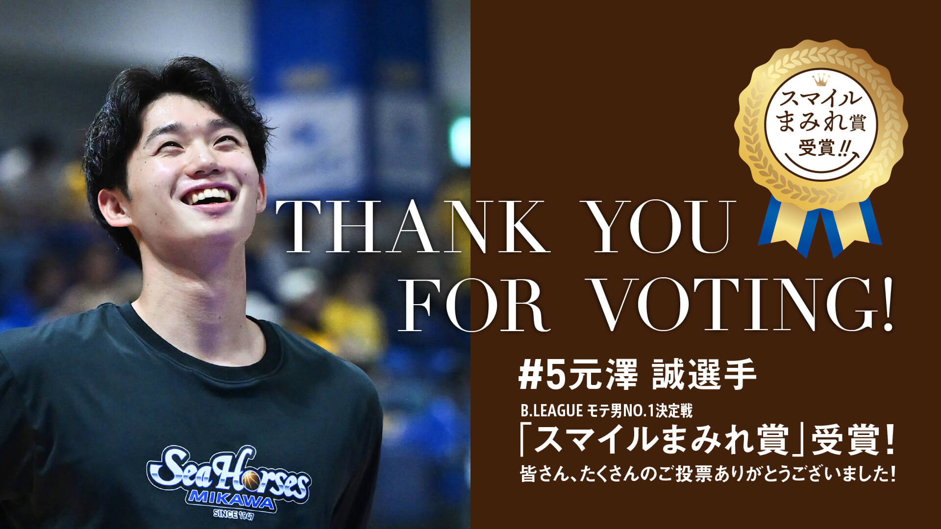 【お知らせ】#5 元澤誠選手「B.LEAGUE モテ男No.1 決定戦 2026」 スマイルまみれ賞受賞