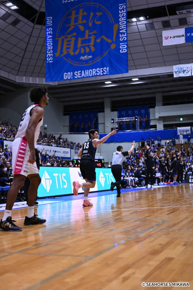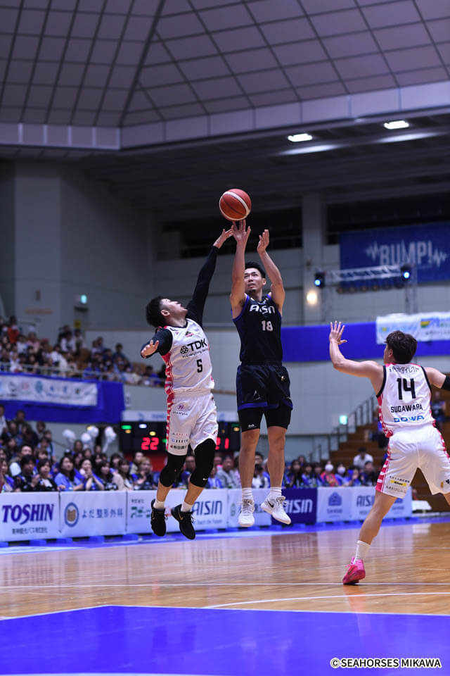 秋田は#12 元田のアタック、#15ライスナーの3Pシュートで対抗するが、#11久保田、#13須田のドライブですぐに返上して流れを渡さない。