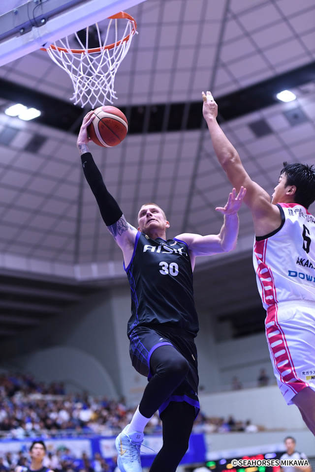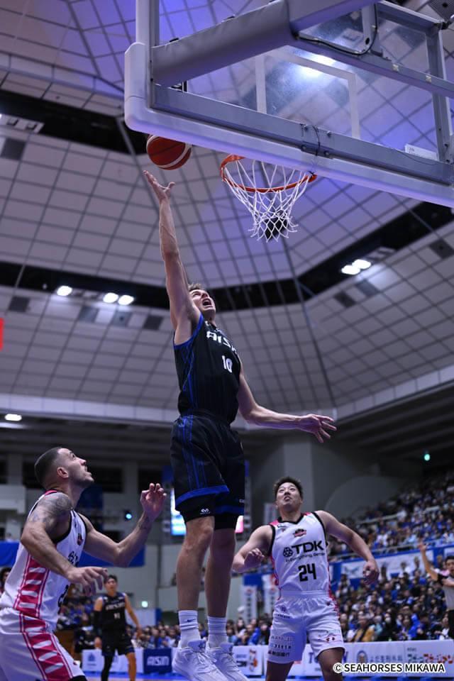 秋田#10ウェッツェルのポストアップで先制されるが、すぐに#19西田(優)の3Pシュートで取り返す。秋田#12元田の3Pシュートで逆転されるも、#10レイマンのアタックで追いつくと、チームアイデンティティでもあるインサイドを固く守り、#10レイマンの3Pシュート、#54ガードナーのバスケットカウントで12-5とリードを広げる。