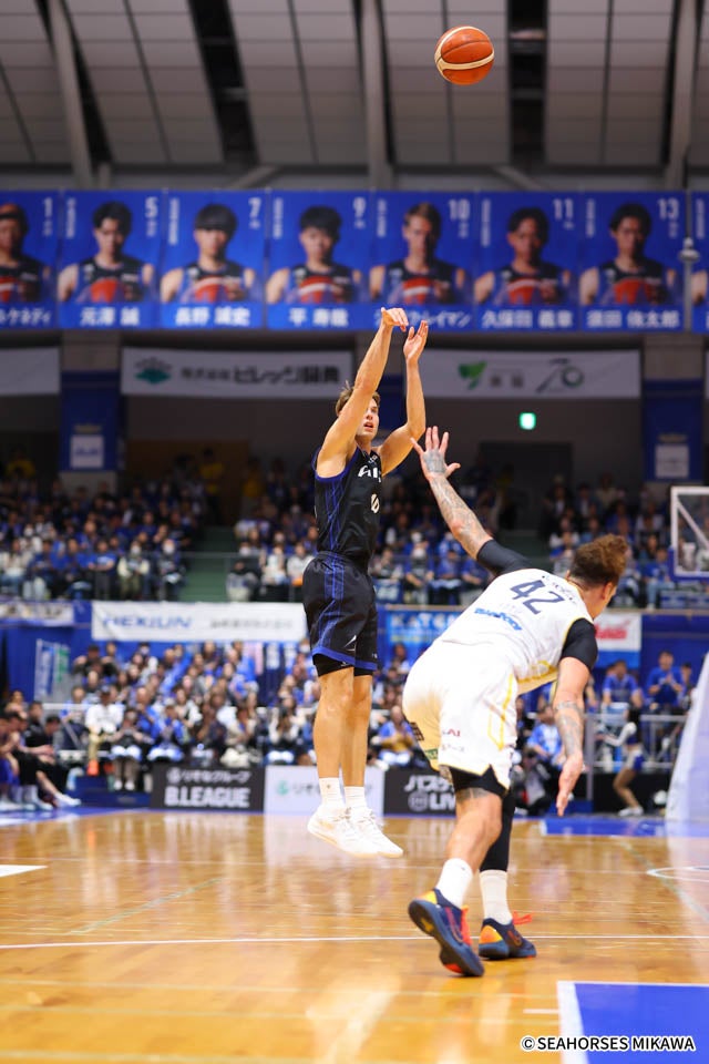 開始早々、華麗なパスワークから#13須田の3Pシュートでリードを奪い返す。アーリーオフェンスから#10レイマンが3Pシュートを打ち抜くと、#11久保田も3Pシュートで続きオフェンスを加速させる。