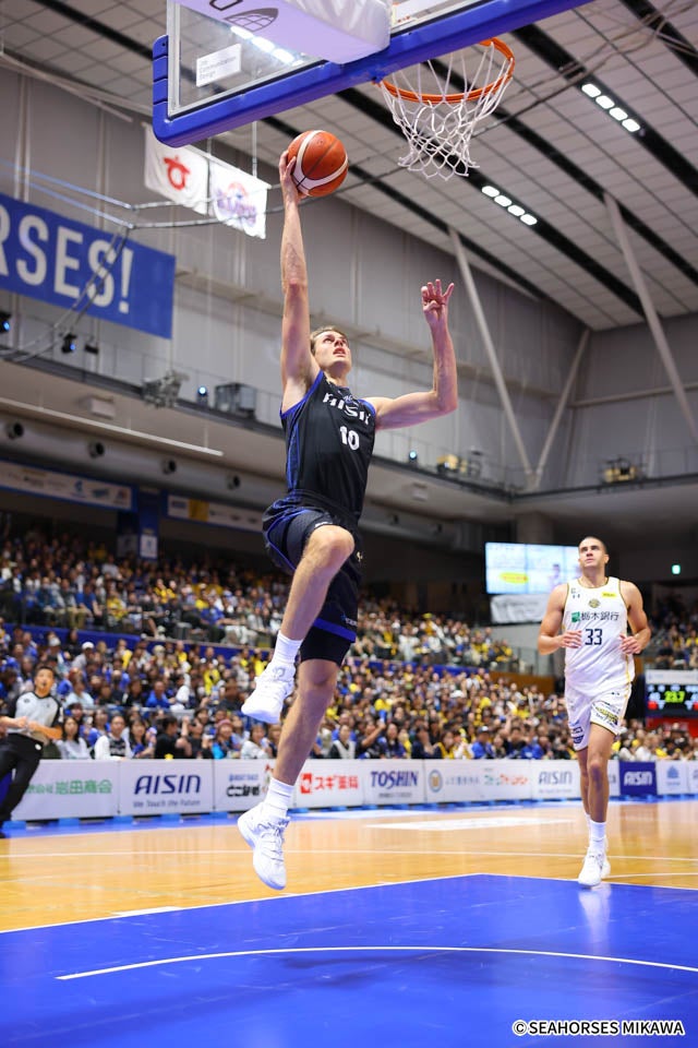 開始3分半には#13須田が体を張ったディフェンスで宇都宮のターンオーバーを誘発、#54ガードナーのロングパスから#10レイマンが速攻を成功させ徐々に宇都宮を突き放す。