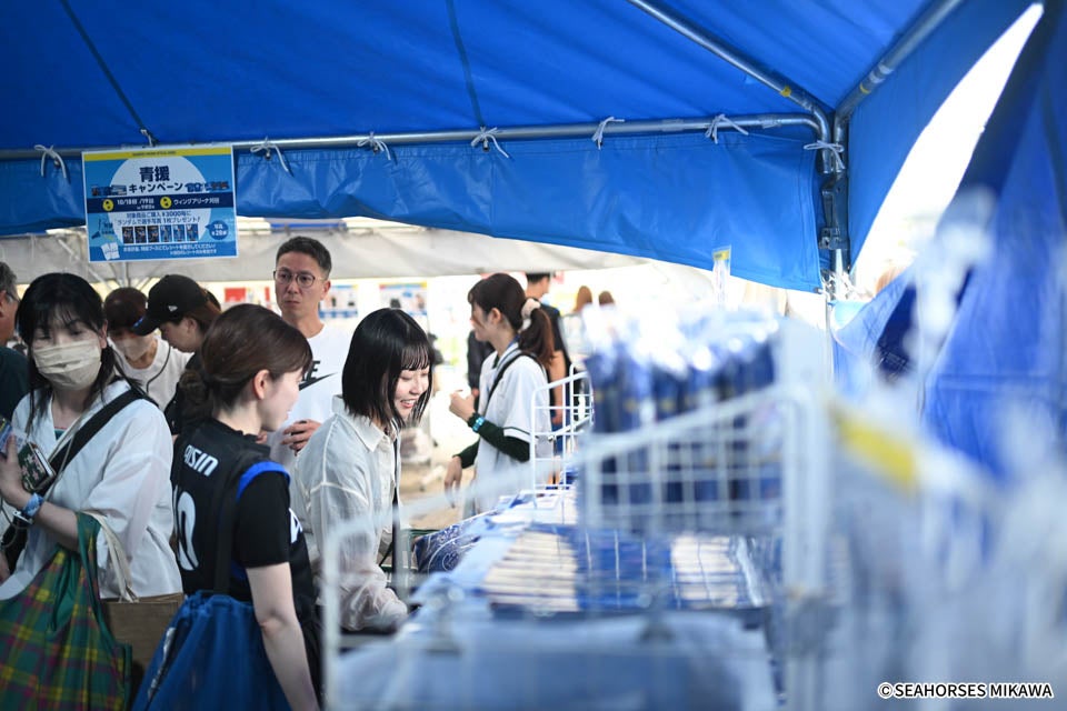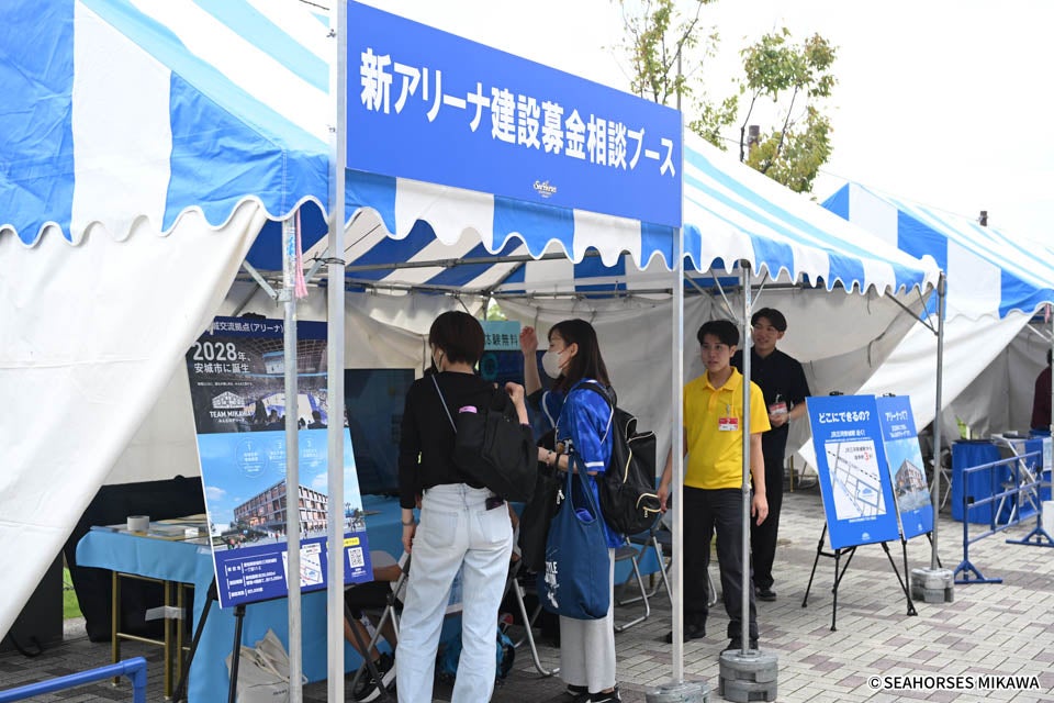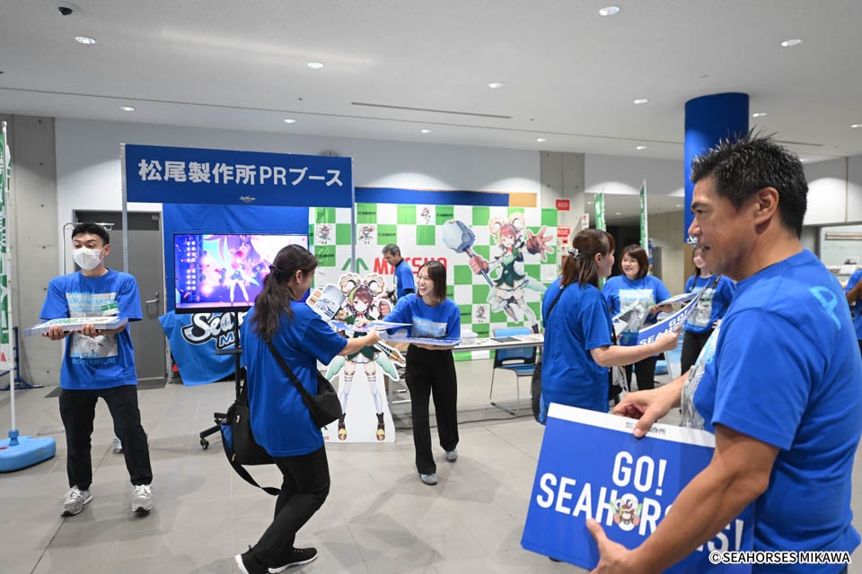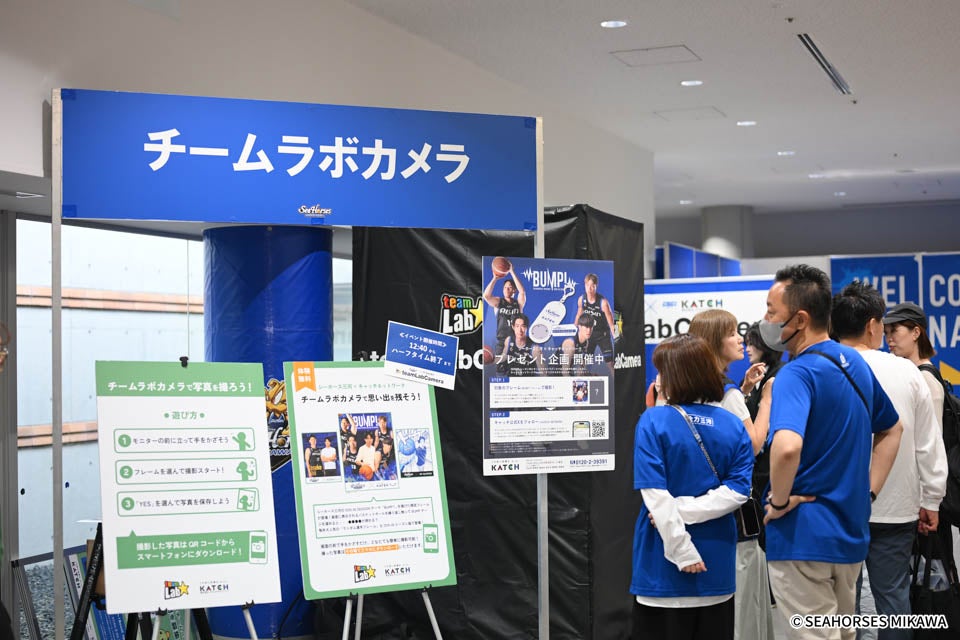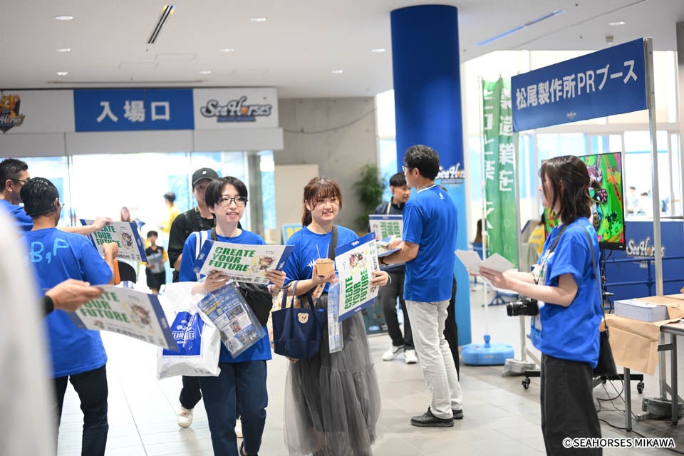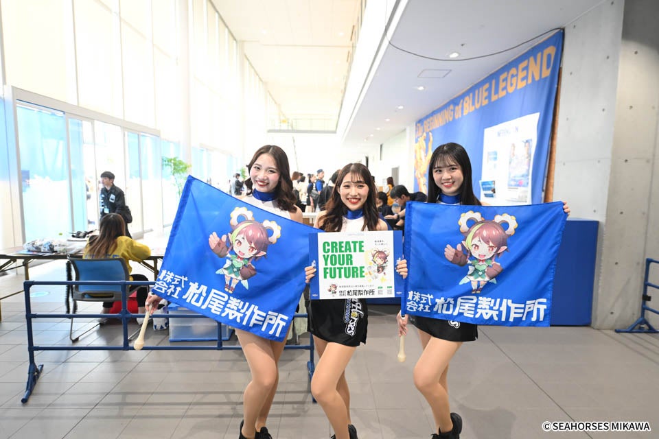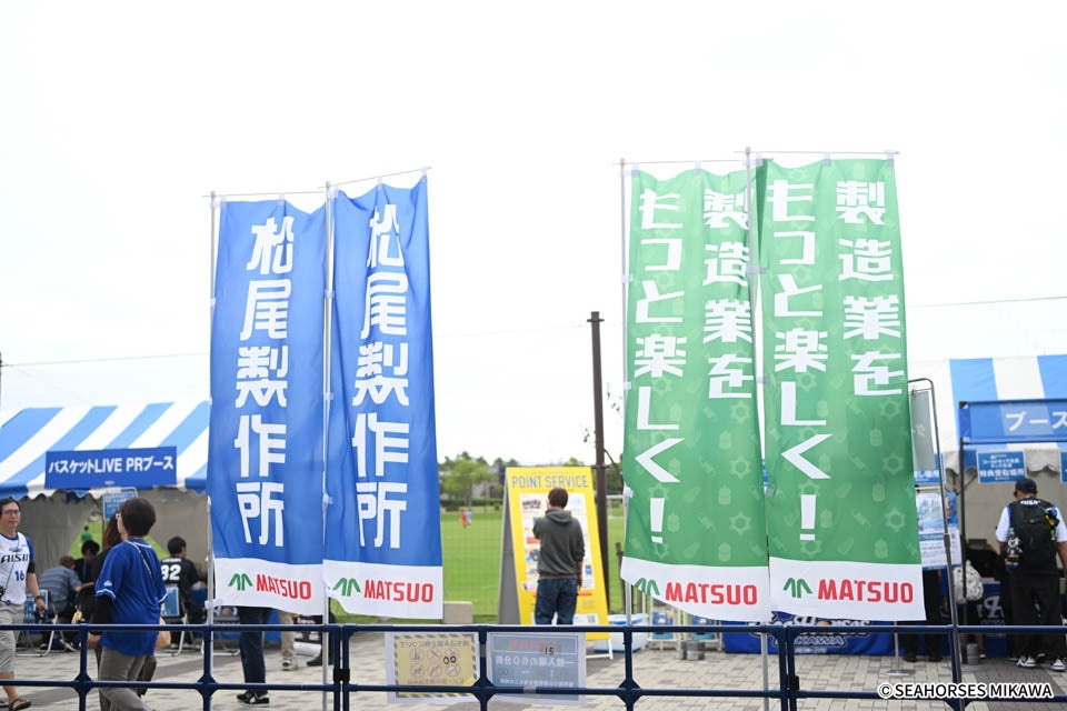 株式会社松尾製作所 Presents シーホース三河ホームゲームのテーマは「BLUE PRIDE」。会場に設置された「#覚悟を掲げろ BLUE PRIDE 撮影ブース」で撮影するファン・ブースターも多く、選手を鼓舞する熱いメッセージを送っていた。