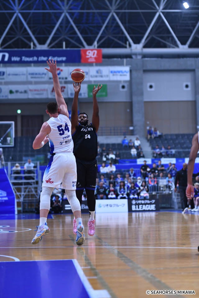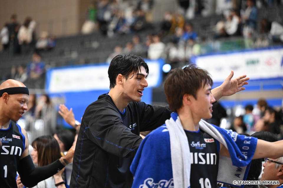 FE名古屋のタイムアウト後、セットオフェンスから#0ピケットに3Pシュートを沈められて2点差に迫られるも、残り31秒に#54ガードナーがタフな姿勢からシュートをねじ込んで77-73とリードを広げる。FE名古屋も#0ピケットの得点で食い下がるが、#19西田(優)がボーナススローを2本とも決めて4点差に突き放す。ホームの“大青援“を背に、粘り強いディフェンスで相手のターンオーバーを誘発するなどリード守り切り、80-75で競り勝った。