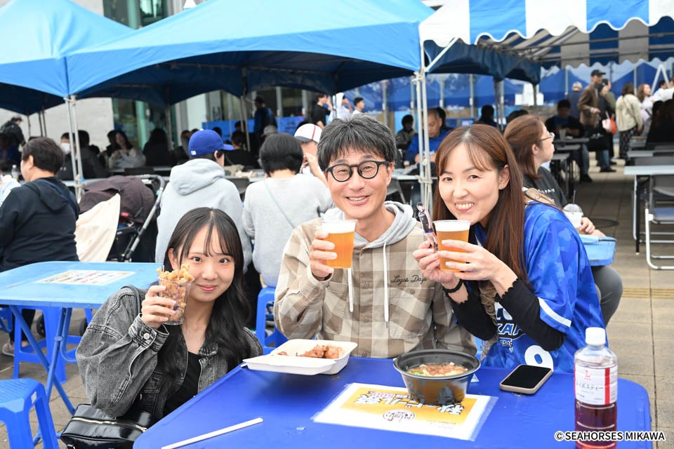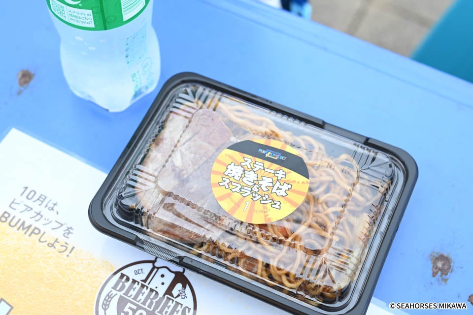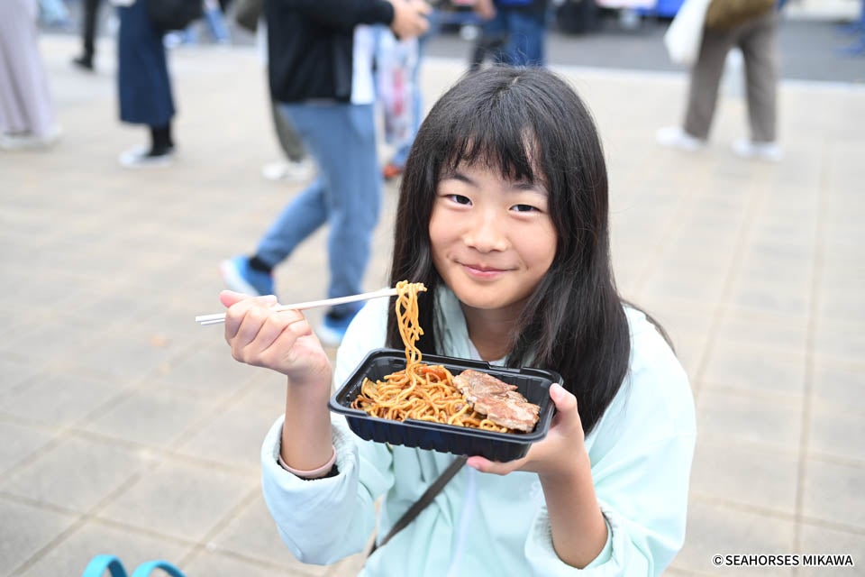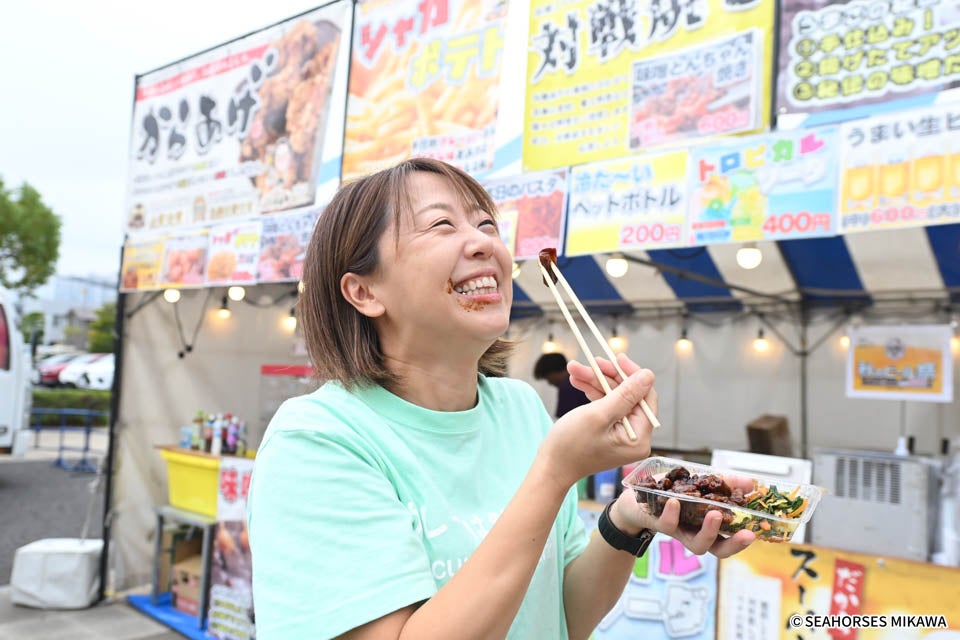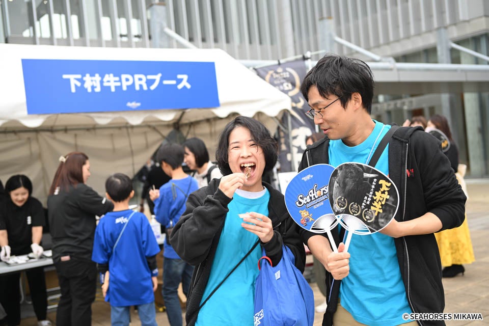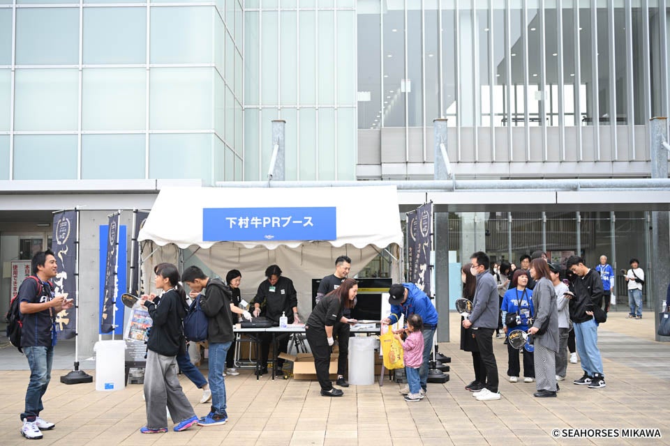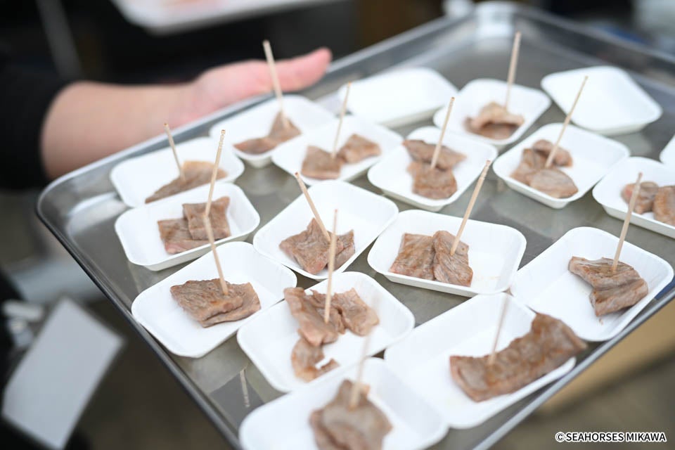 この日は、OnFire賞でおなじみ、愛知県産の黒毛和牛「下村牛」の試食ブースが設けられ、たくさんのファン・ブースターが脂ののった下村牛に舌鼓を打っていた。