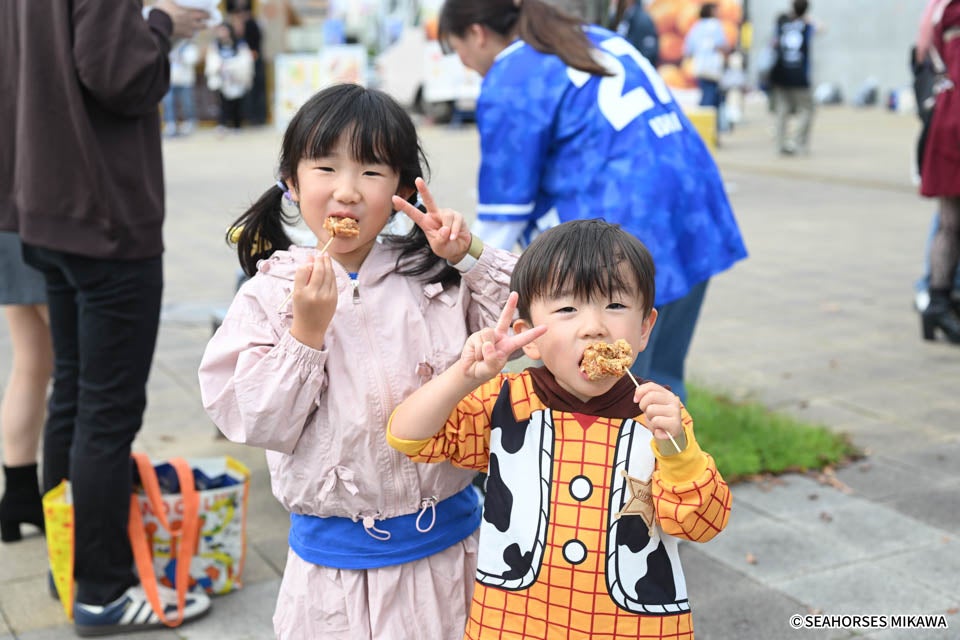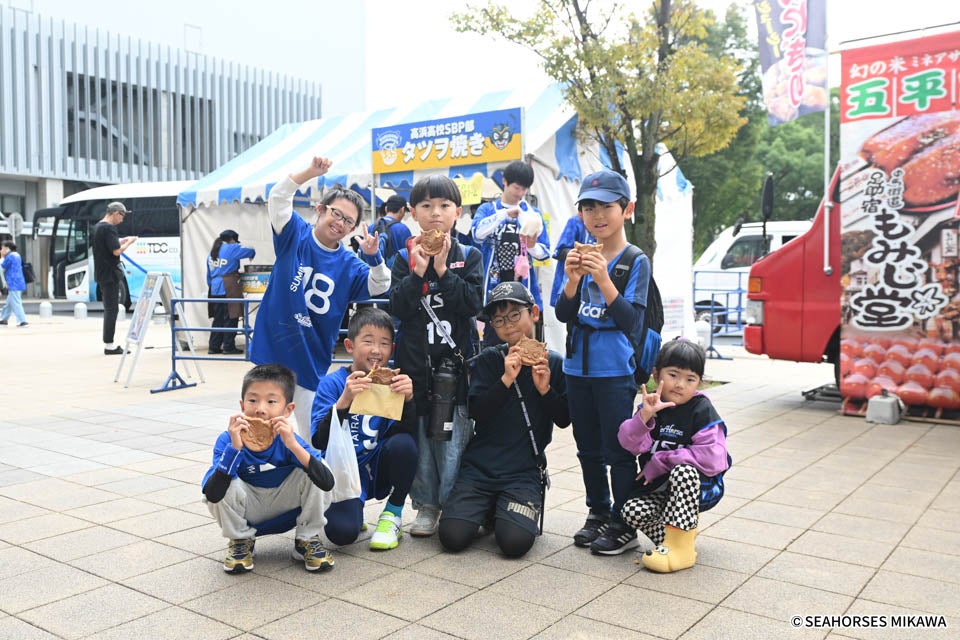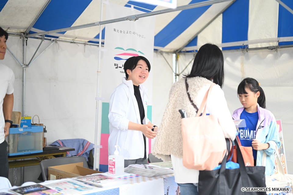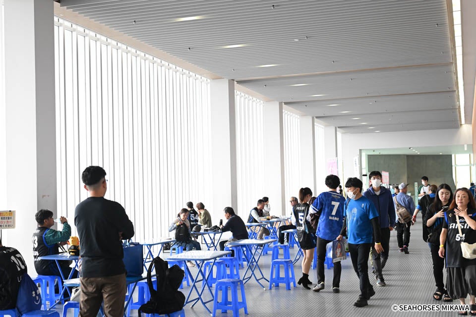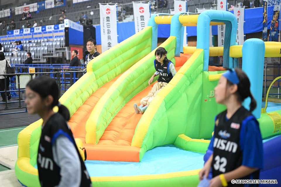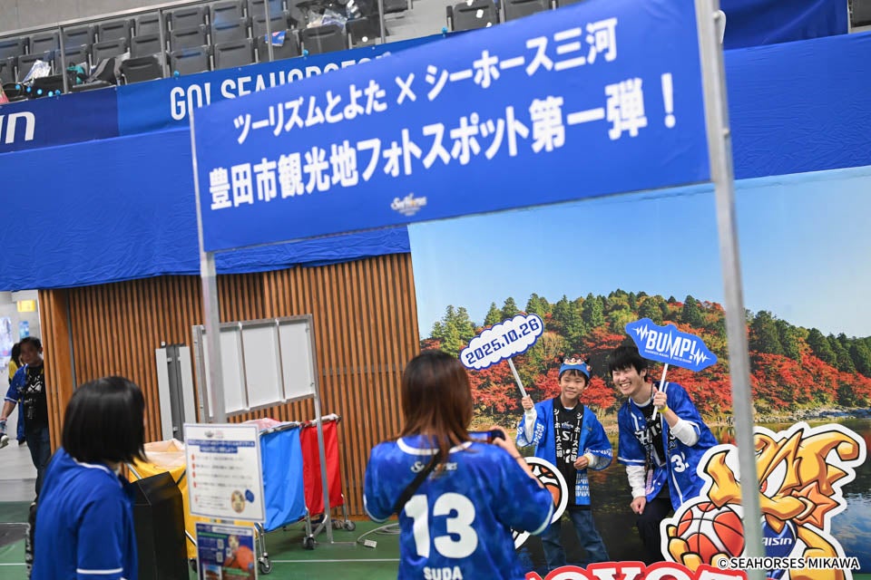 会場には香嵐渓フォトスポットやスカイホール豊田恒例の「ふわふわトランポリン」も登場。たくさんのファン・ブースターがトランポリンで遊んだり、シーホースくん、タツヲのパネルと共に香嵐渓をバックに写真を撮ったりと、試合前のひと時を楽しんでいた。