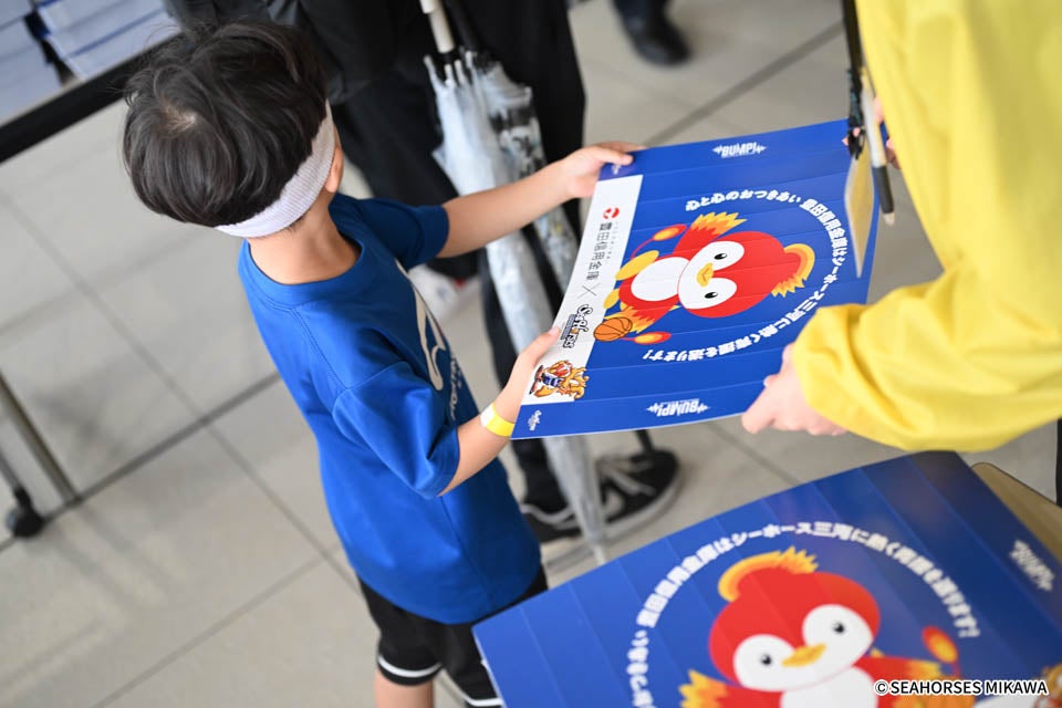 来場者全員に「豊田信用金庫xシーホース三河」オリジナルハリセンを、ツーリズムとよた 豊田市観光PRブースでは先着250名にオリジナルコラボクッキーをプレゼント。