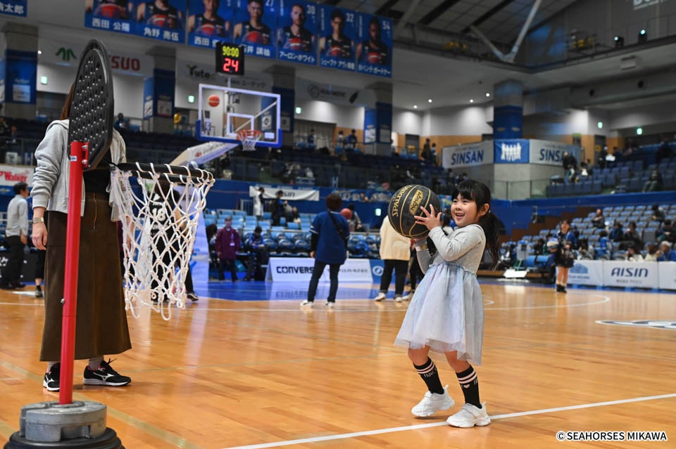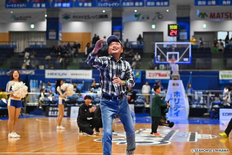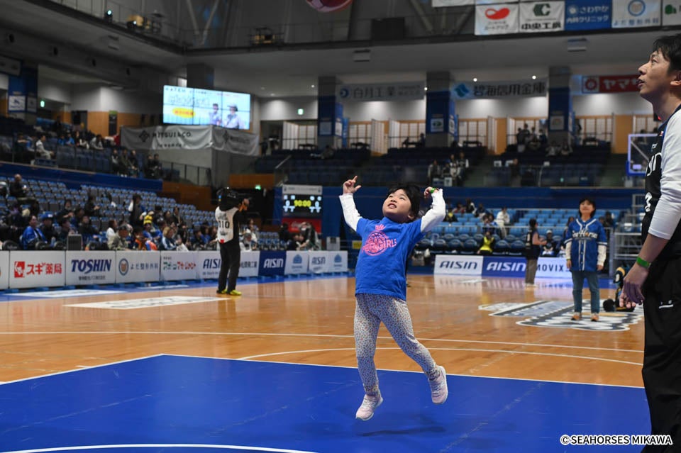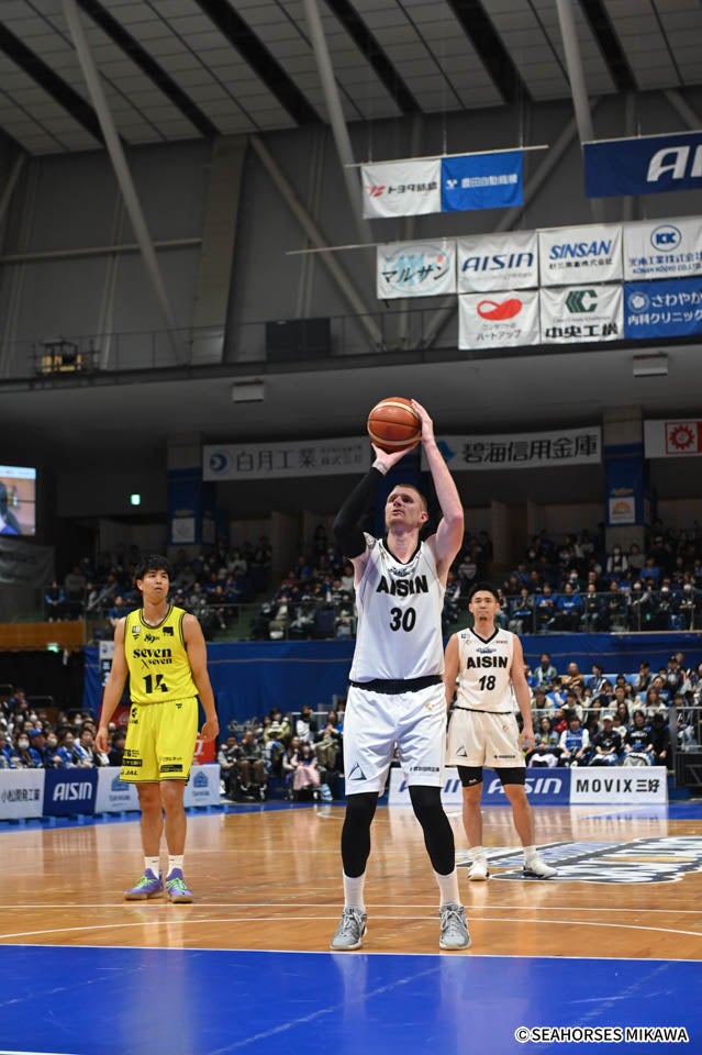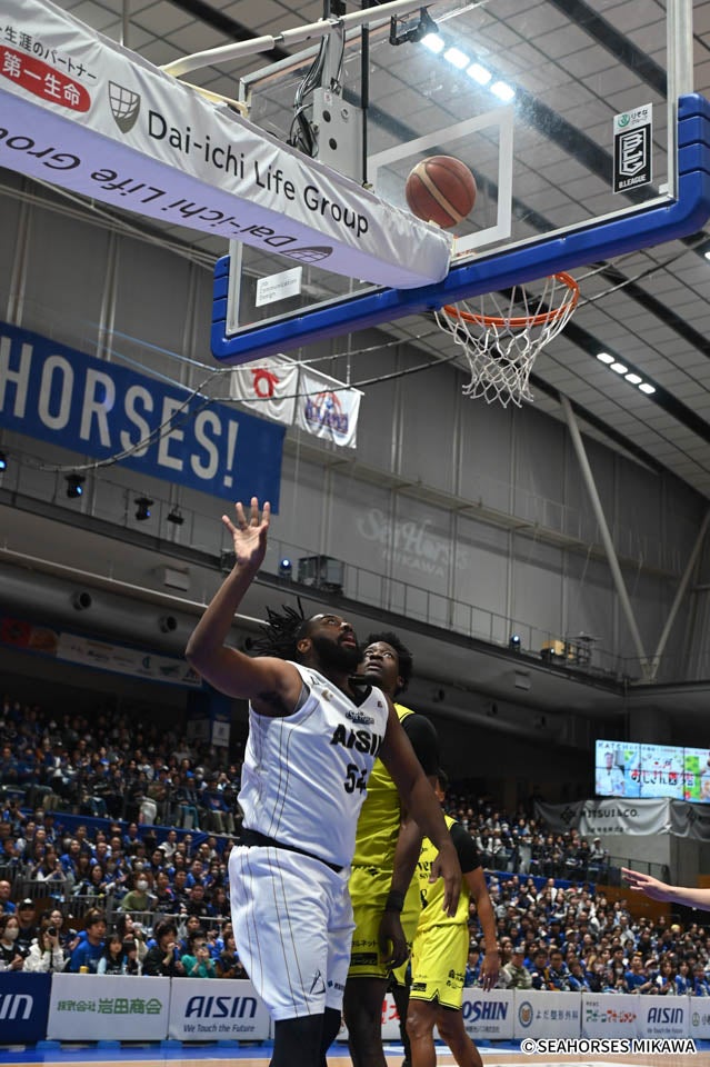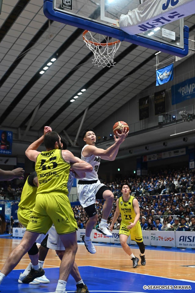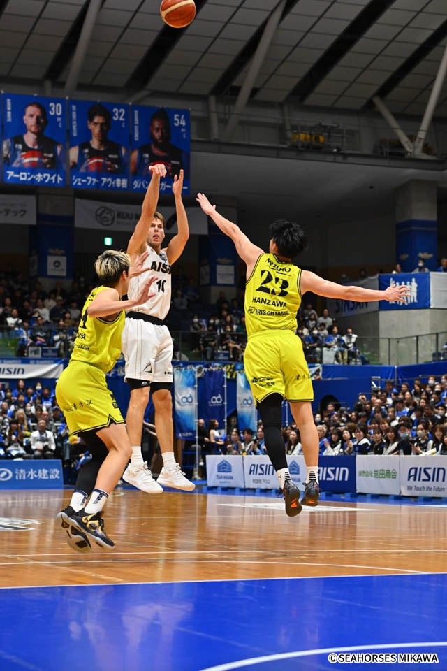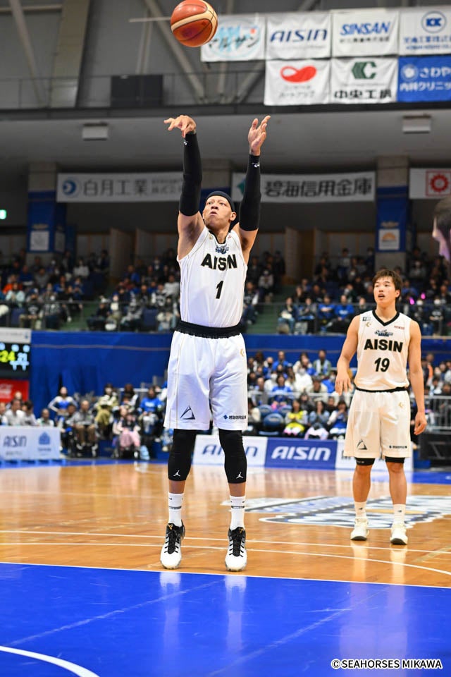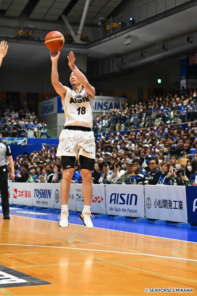 仙台に0-5と先行されるが、開始2分に#54ガードナーがパワーで押し込んでB1通算11000得点の偉業を達成する。さらに#7長野の3Pシュートで追いつくと、その後は仙台が突き放しては三河が追いかける展開が続く。