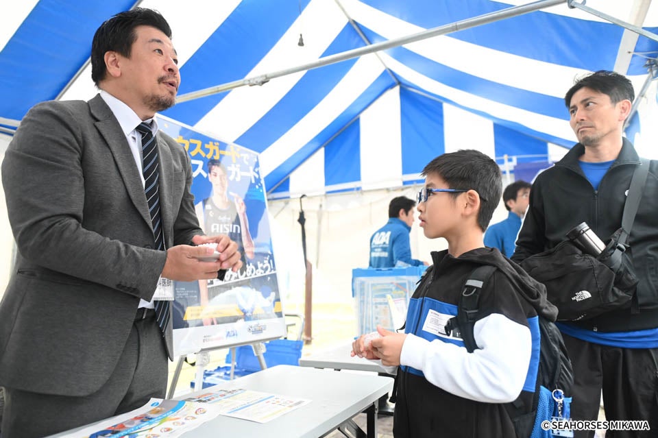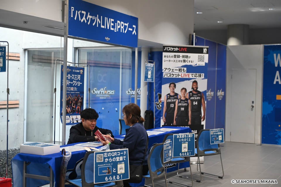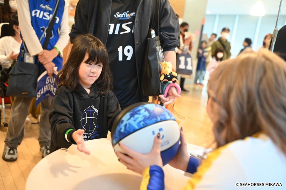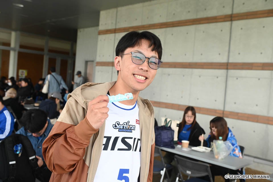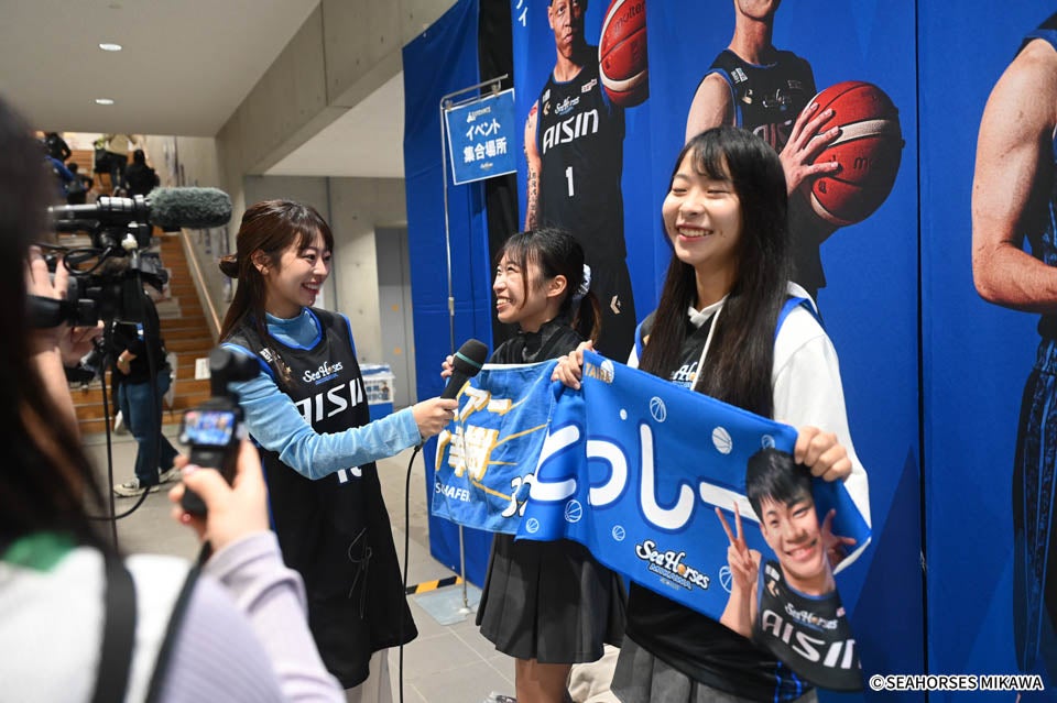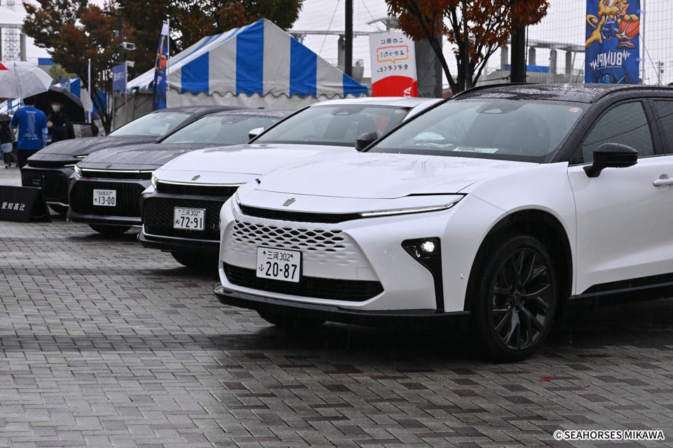 アイシンPresents シーホース三河ホームゲームのテーマは「ファミリーDAY」。ウィングアリーナ刈谷の前では、愛知トヨタ「CROWN EXHIBITION」を開催。リッチマンHCも愛用するCROWNが4モデル勢揃いした光景は圧巻で、雨の中にもかかわらず多くのファン・ブースターが間近で見たり、試乗したりして、CROWNを体感していた。