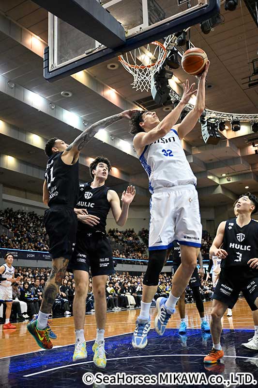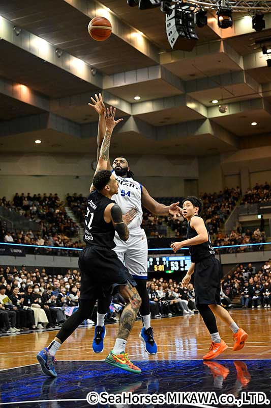 ラストオフェンスでは#7長野との2メンゲームから#30ホワイトがフリースローを獲得し、39-44と5点リードでハーフタイムを迎える。