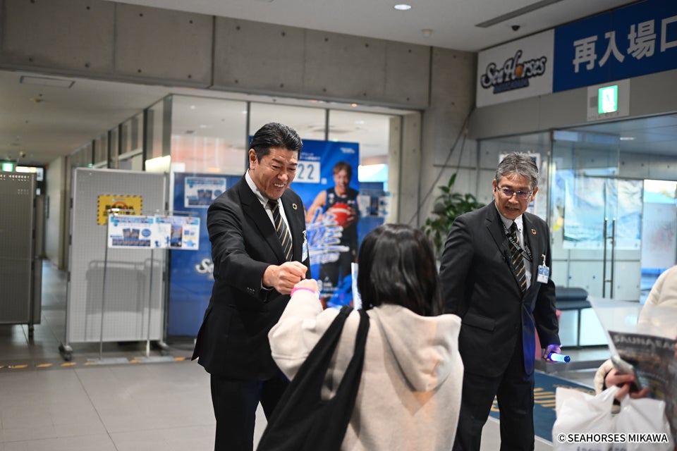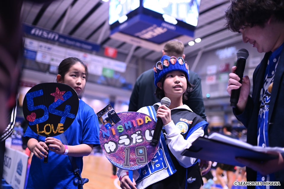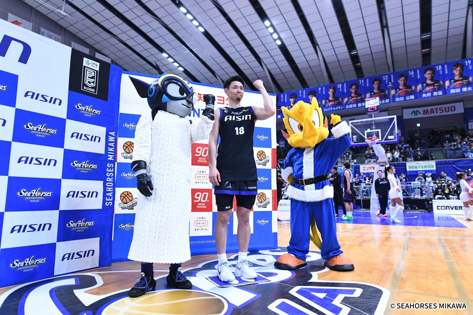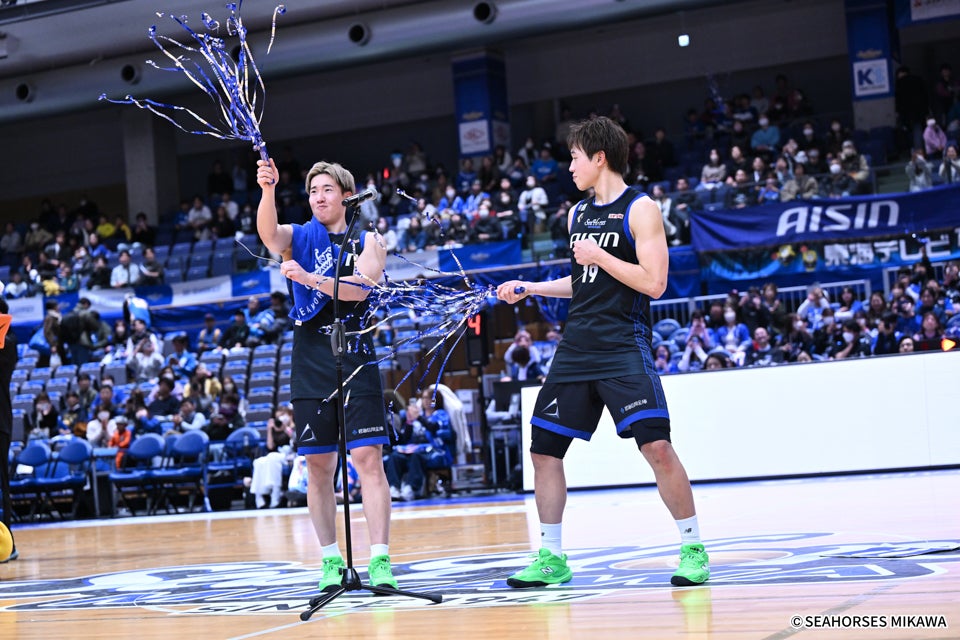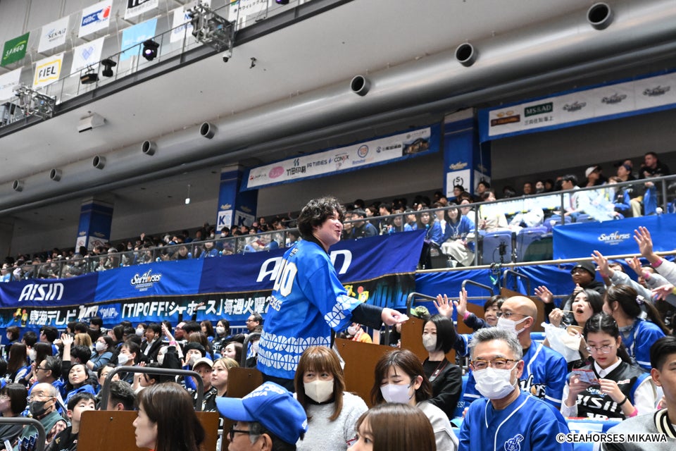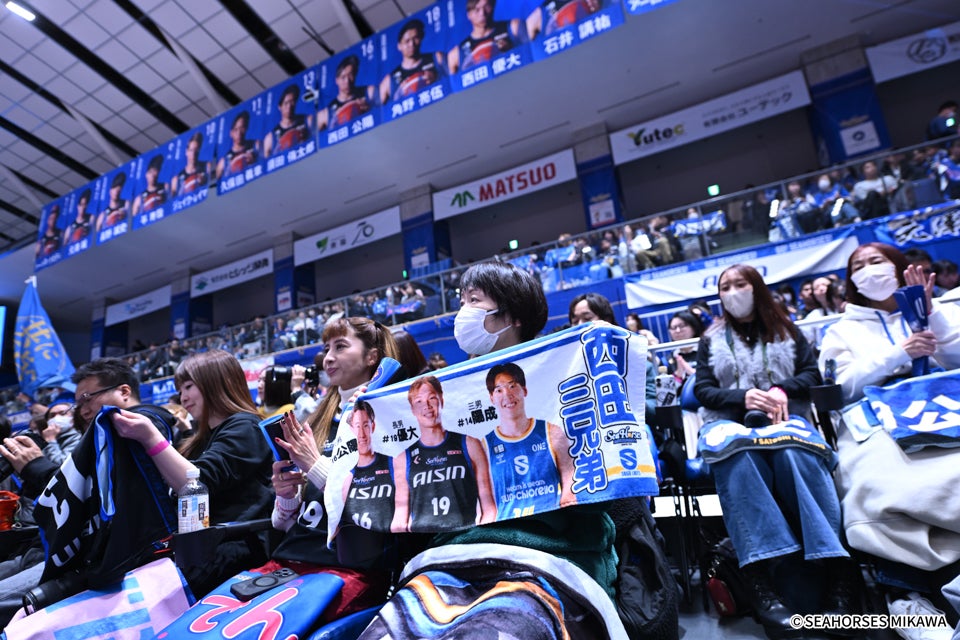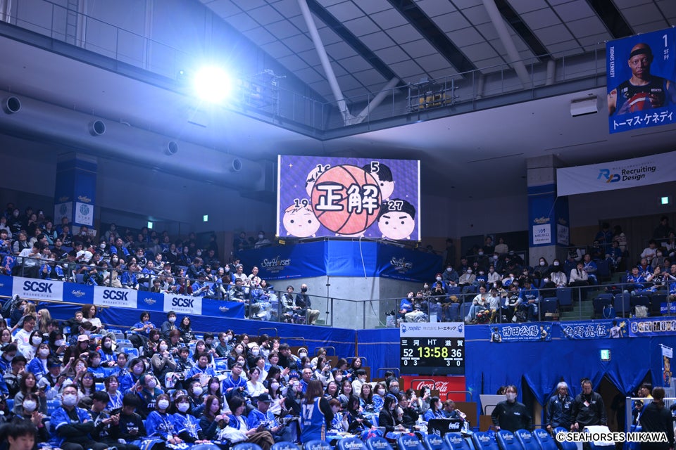 また、スターティングファイブ紹介時には、昨シーズンまで三河に在籍したオーガスト選手の凱旋を歓迎する映像が流れ、三河のファン・ブースターからも温かい拍手が送られていた。