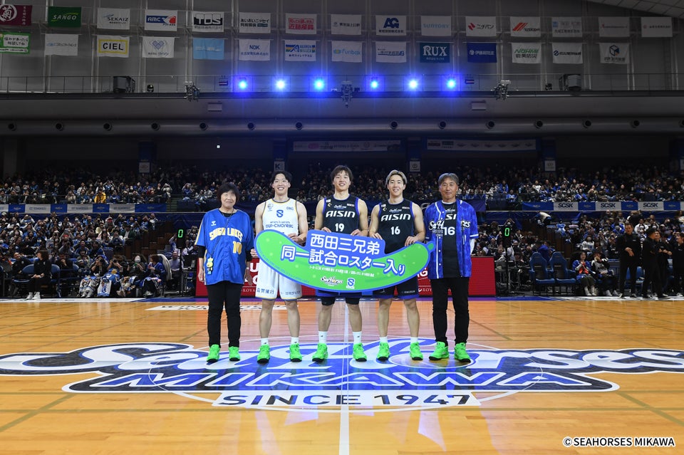 試合前には、滋賀に所属する西田陽成選手と、三河の西田優大選手、公陽選手とBリーグ史上初めて三兄弟が同一試合にロスター入りしたことを記念してフォトセッションが行われた。サプライズでご両親も登場。家族全員がキュウリカラーのシューズで揃え、仲の良さが垣間見えた。
