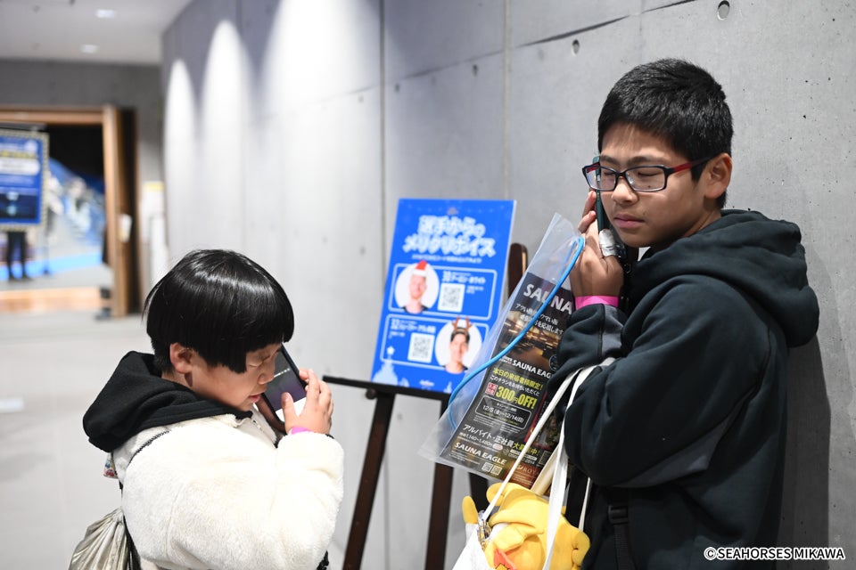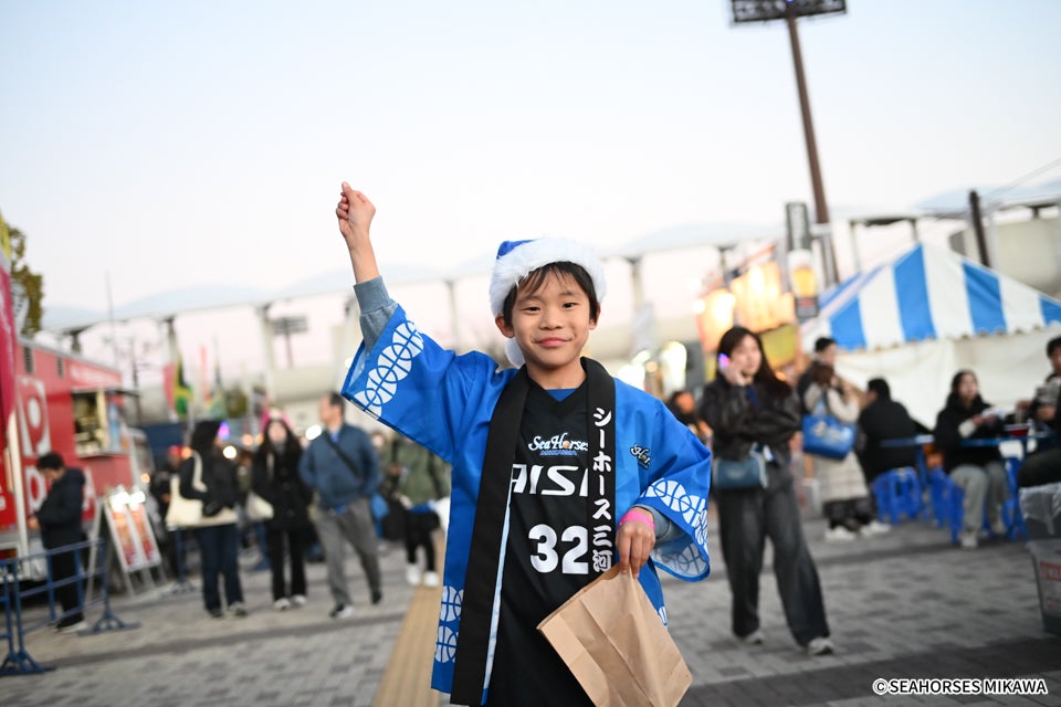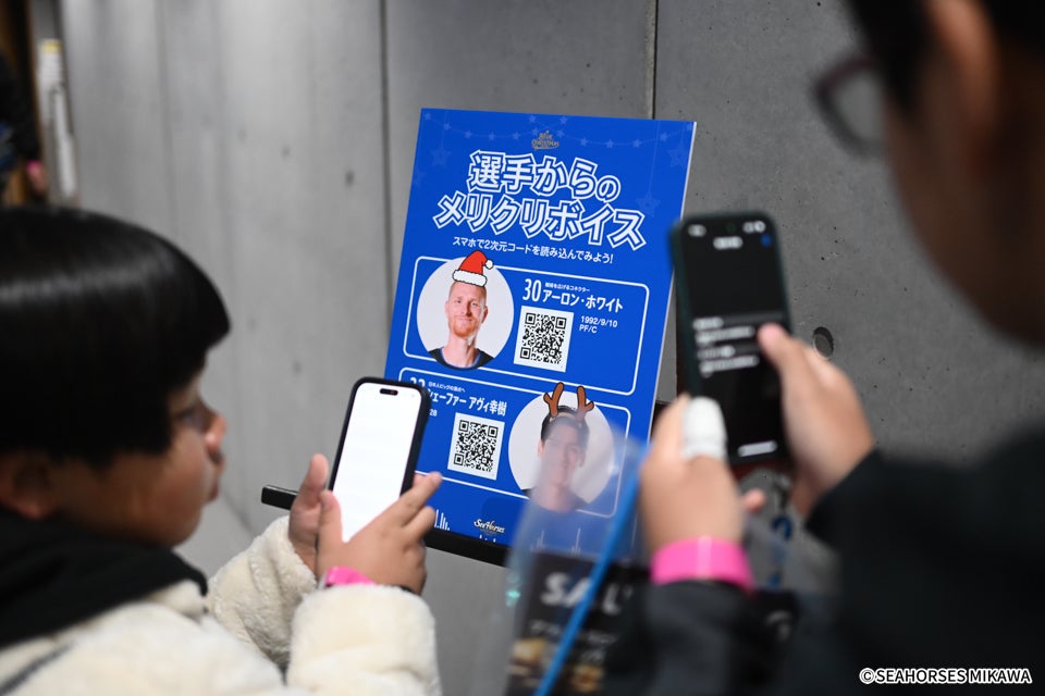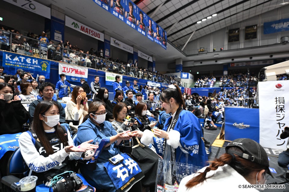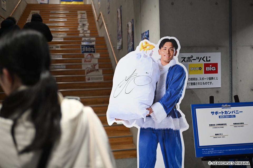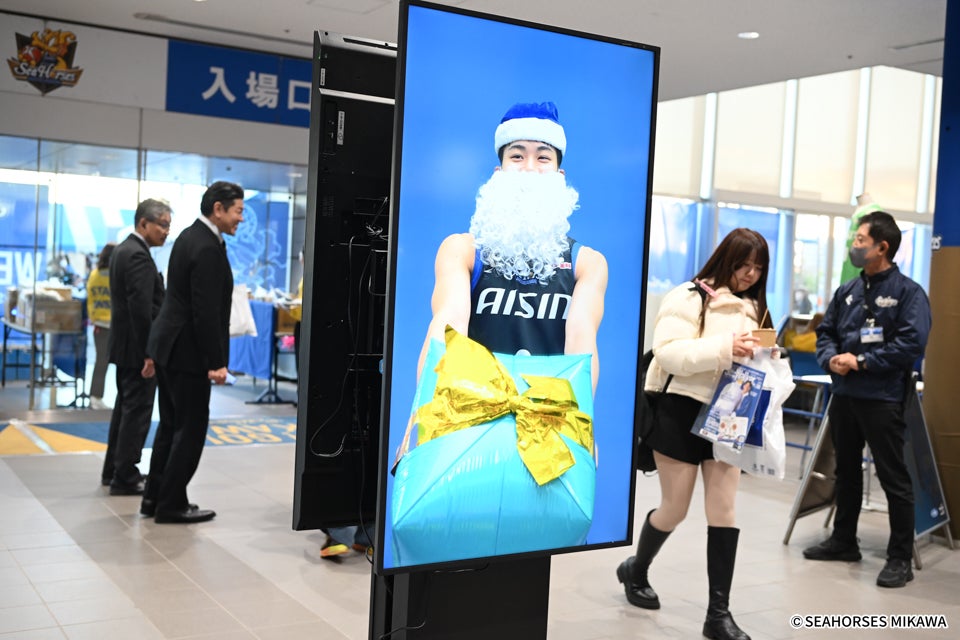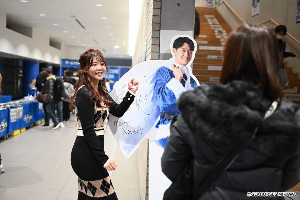 クリスマス衣装を身につけた元澤選手、久保田選手の等身大パネルがお出迎えし、SuperGirlsが真っ白なクリスマス衣装でパフォーマンスを行って試合に華を添えた。観客席にはクリスマス衣装に身を包んだファン・ブースターの姿も。