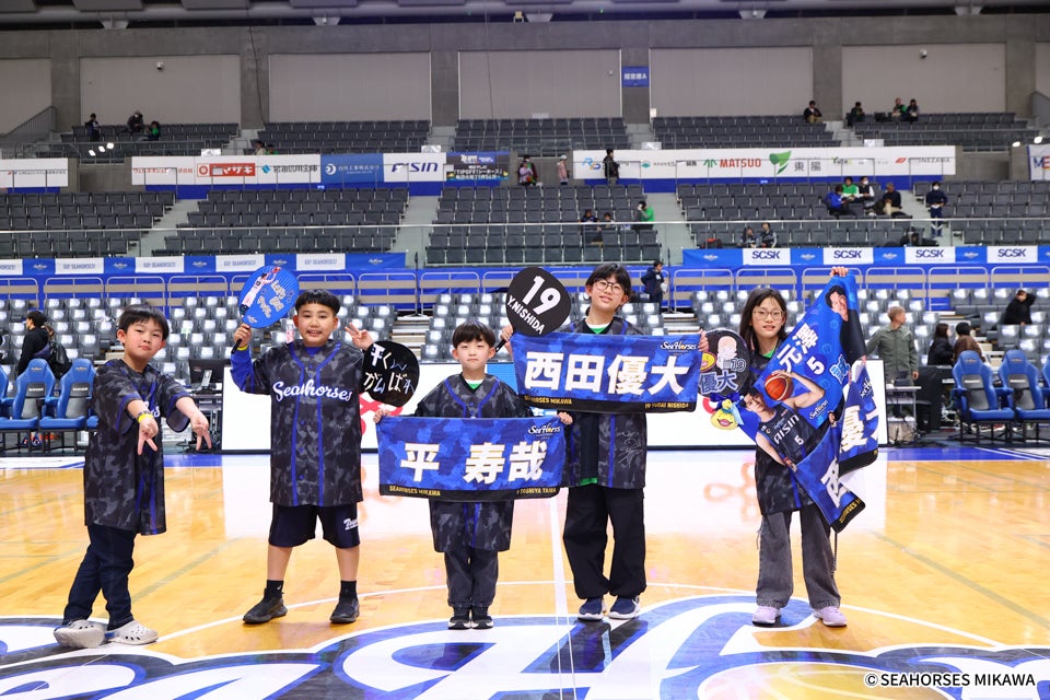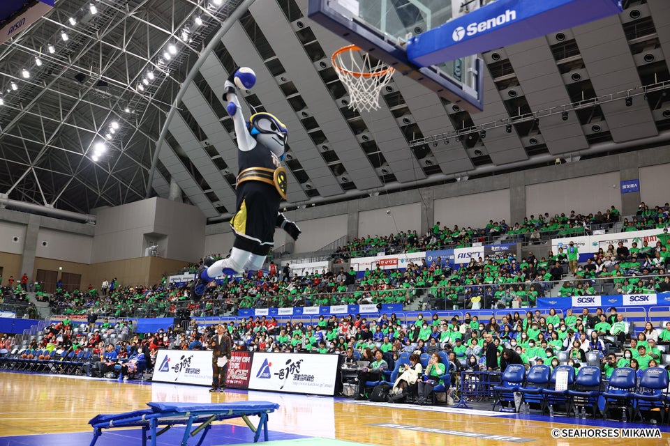抹茶のまち 西尾市Presents シーホース三河ホームゲームは、来場者全員に抹茶グリーンの「西尾市xシーホース三河」オリジナルTシャツとオリジナルハリセンをプレゼント。選手も抹茶グリーンの西尾市コラボユニフォームを着用し、アリーナ全体が鮮やかな抹茶グリーン一色に包まれた。
